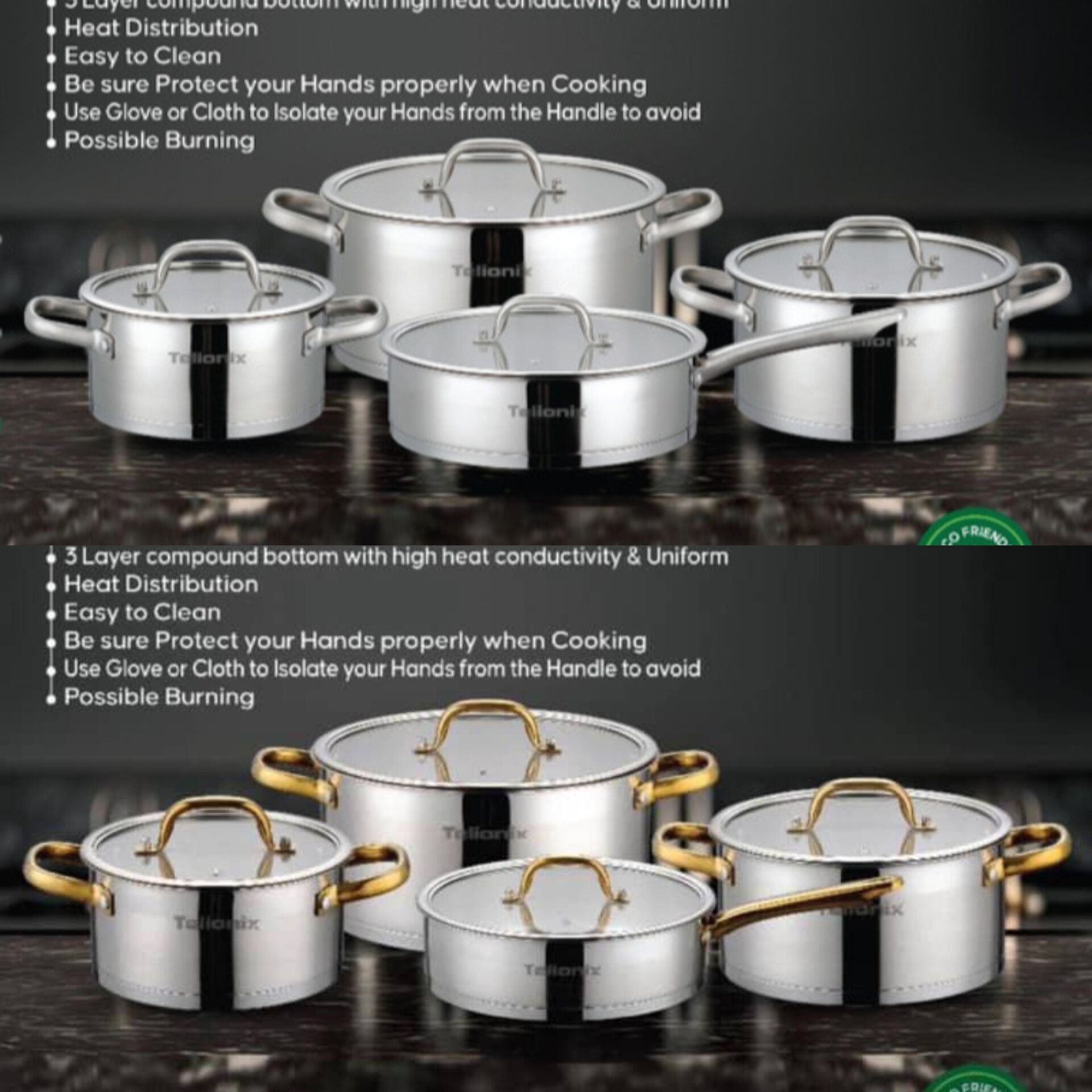 سرویس قابلمه ۸ پارچه استیل برند تلیونیکس دو مدل دسته طلایی و دسته استیل
